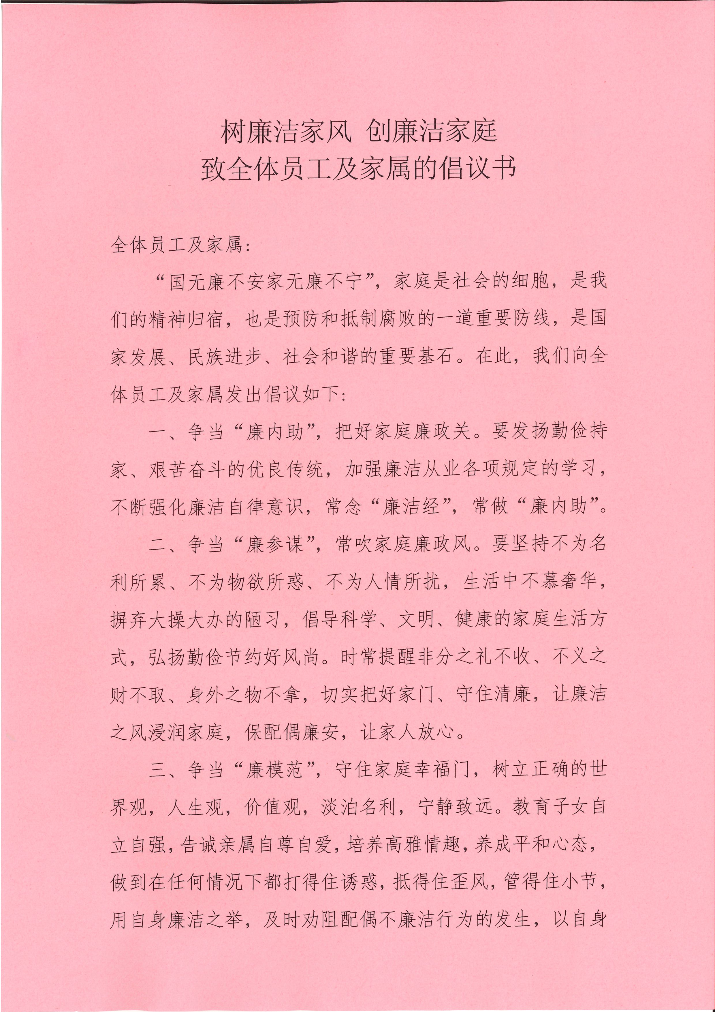 樹(shù)廉潔家風(fēng) 創(chuàng)廉潔家庭 致全體員工及家屬的倡議書(shū)