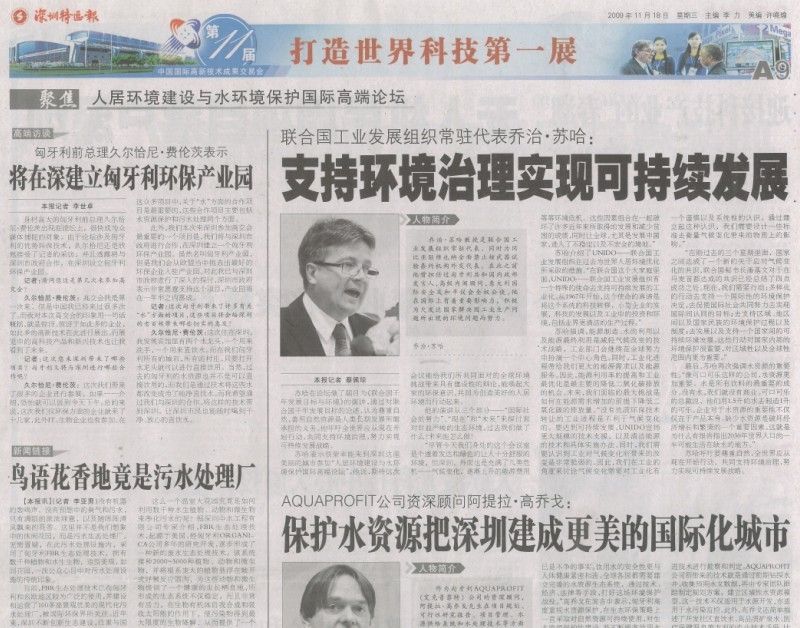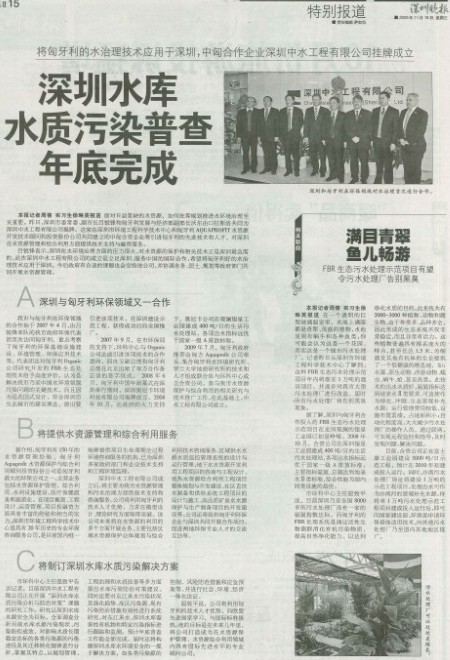 2009年11月18日下午,由我中心與匈牙利最大的環(huán)保公司AQUAPROFIT公司合作建立的深圳中水工程有限公司宣告成立,深圳市委常委、副市長呂銳鋒與匈牙利發(fā)展與經(jīng)濟(jì)部副部長沃爾由?拉斯洛為中水公司成立揭牌。