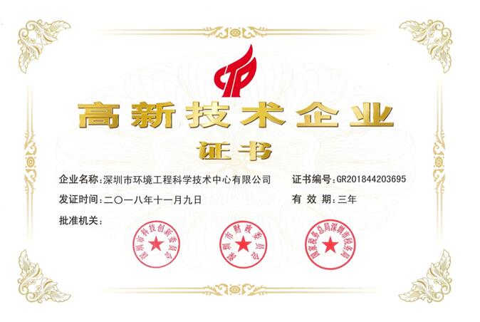 面朝大海,春暖花開。新春伊始,深圳市環(huán)境工程科學(xué)技術(shù)中心有限公司傳來喜訊:公司榮獲“國(guó)家高新技術(shù)企業(yè)”證書(證書號(hào):GR201844203695)。