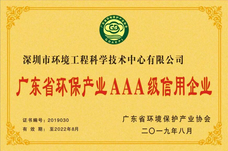 2019年8月,深圳市環(huán)境工程科學(xué)技術(shù)中心有限公司順利通過廣東省環(huán)保產(chǎn)業(yè)協(xié)會的評審,獲得“廣東省環(huán)保產(chǎn)業(yè)AAA級信用企業(yè)”榮譽。