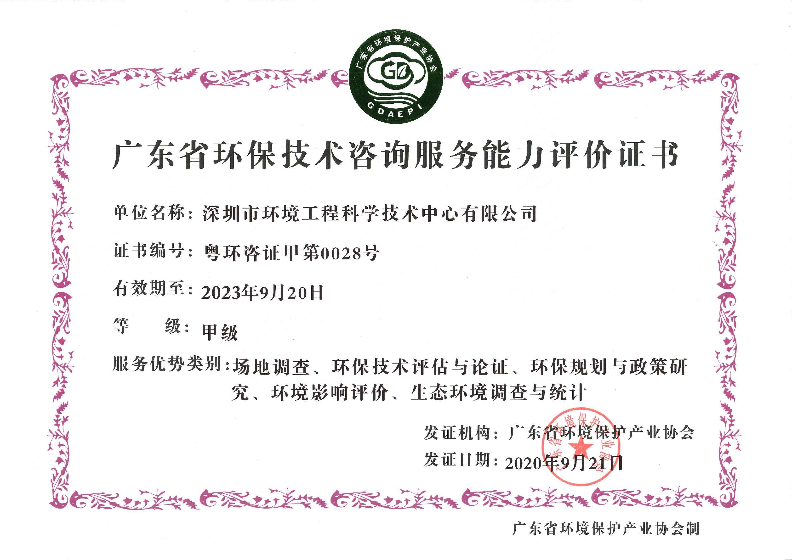 我司獲批廣東省環(huán)保技術(shù)咨詢服務(wù)能力評(píng)價(jià)“甲級(jí)”證書