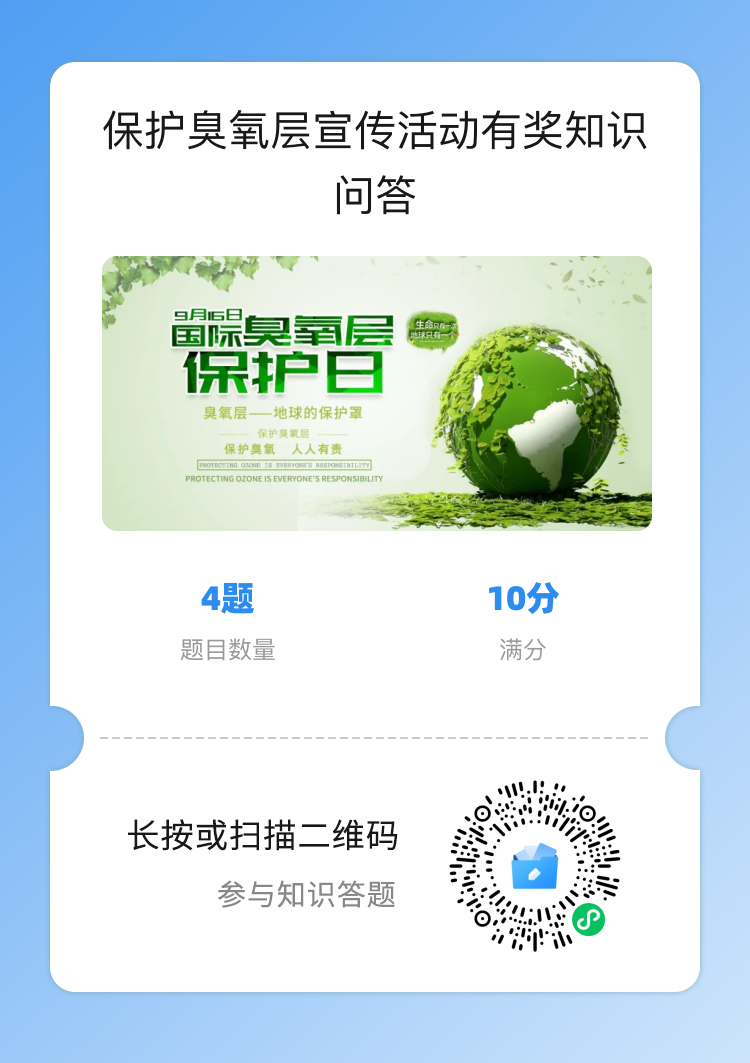 為貫徹落實國家履行《蒙特利爾議定書》相關規(guī)定,宣傳保護臭氧層知識,提高市民生態(tài)環(huán)境保護意識,推廣綠色消費理念,踐行綠色生活方式,共同保護我們賴以生存的地球,由深圳市生態(tài)環(huán)境局指導、深圳市環(huán)境工程科學技術中心有限公司(簡稱環(huán)科中心)舉辦的國際保護臭氧層日有獎知識問答活動上線啦!