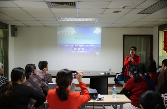 3月23日下午,環(huán)科中心志愿者和深物業(yè)集團(tuán)志愿者聯(lián)手走進(jìn)龍華新區(qū)風(fēng)和日麗小區(qū),運(yùn)用環(huán)保專業(yè)化技術(shù)知識,以貼近實(shí)際、貼近生活、貼近群眾的方式,為該小區(qū)居民舉辦了一場“低碳環(huán)保、生態(tài)文明——健康時尚新生活”的講座,大力倡導(dǎo)低碳、環(huán)保生活方式方法,講解如何做到生活低碳、環(huán)保?;顒由钍苄^(qū)廣大居民的熱烈歡迎和積極響應(yīng),他們表示要將學(xué)到的低碳知識應(yīng)用于日常生活中。